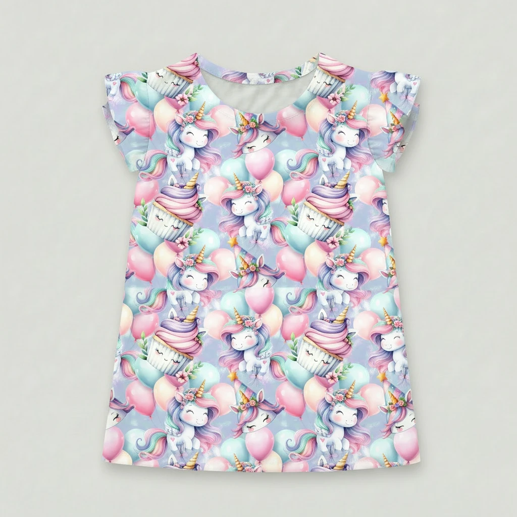 Urocza bluzka dziewczęca z motywem jednorożców i balonów to idealna propozycja dla małych miłośniczek magicznych, pastelowych stylizacji. Delikatny wzór przedstawia słodkie jednorożce, kolorowe balony oraz elementy słodkości w subtelnych odcieniach różu, błękitu i fioletu, tworząc wyjątkowy, bajkowy klimat.
