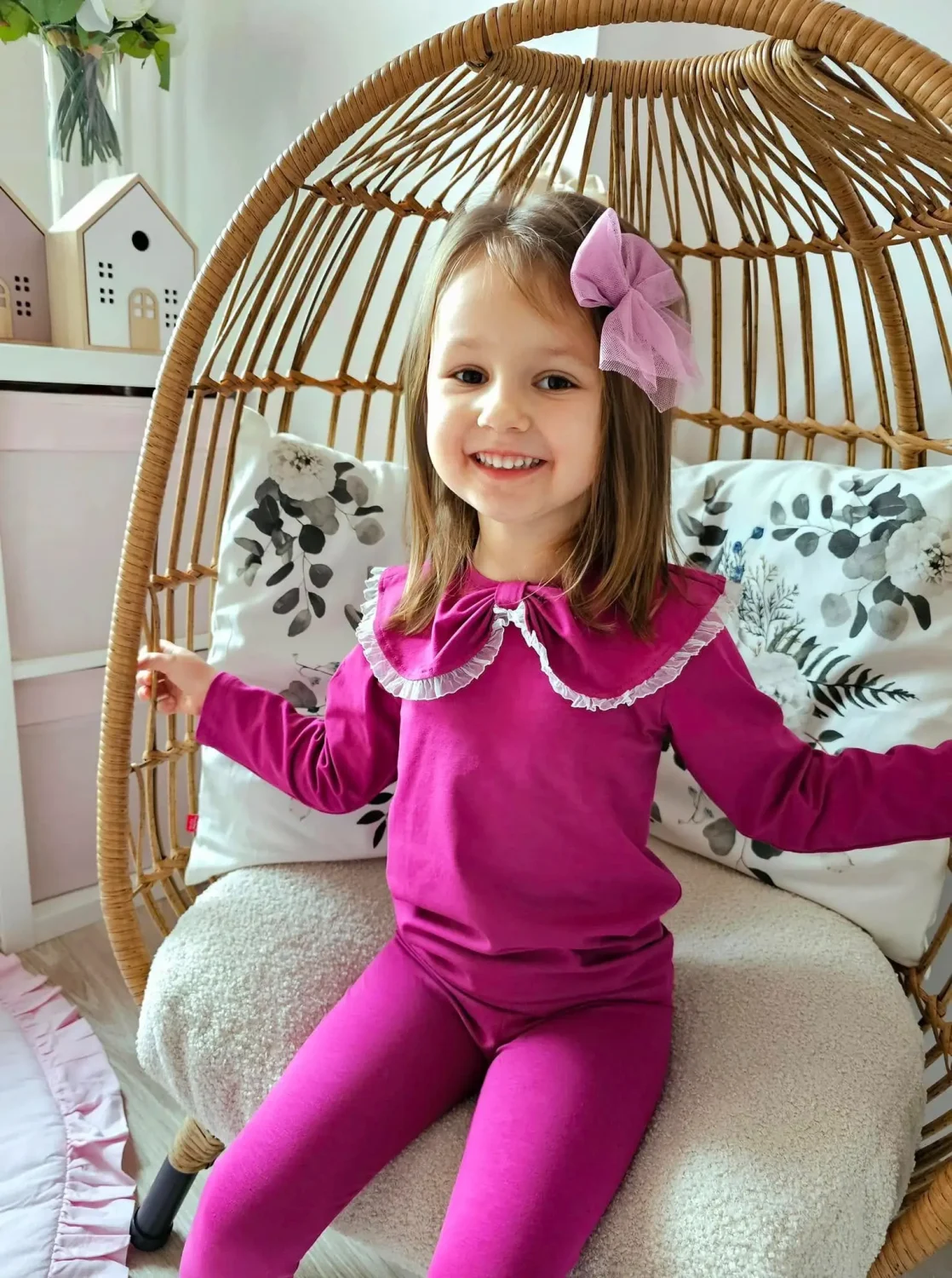 Elegancka bluzka dziecięca z kołnierzykiem w wyrazistym kolorze amarant, wykończona subtelną gumokoronką, to doskonały wybór dla dziewczynek, które lubią stylowe i wyjątkowe ubrania. Intensywny odcień amarantu nadaje bluzce charakteru, zachowując jednocześnie elegancki i dziewczęcy wygląd.
