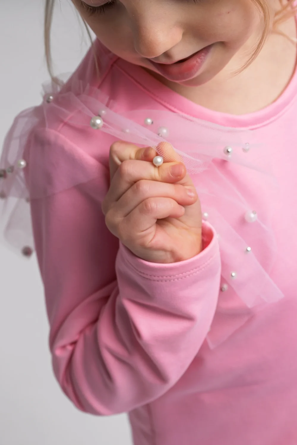 👗 Body-bluzka / Bluzka dziewczęca „Cukierkowy Róż” z tiulem i perełkami