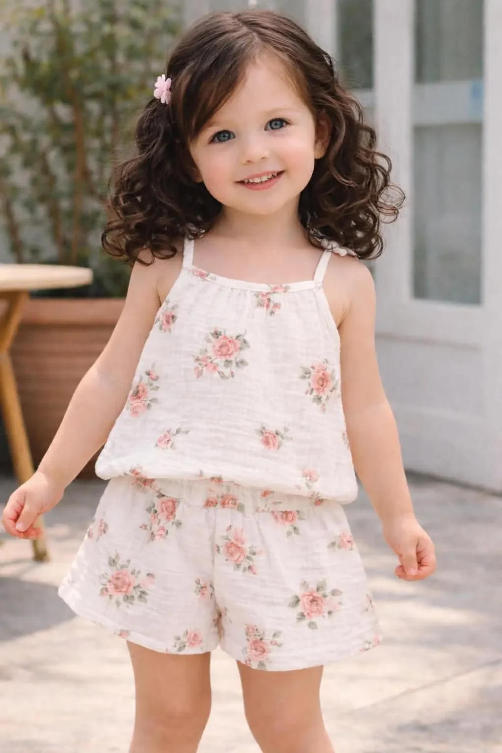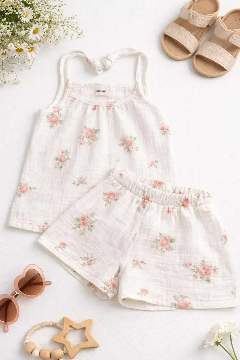 Komplet kwiatuszki na muślinie – szorty i wiązana bluzeczka (rozmiary 74–140)