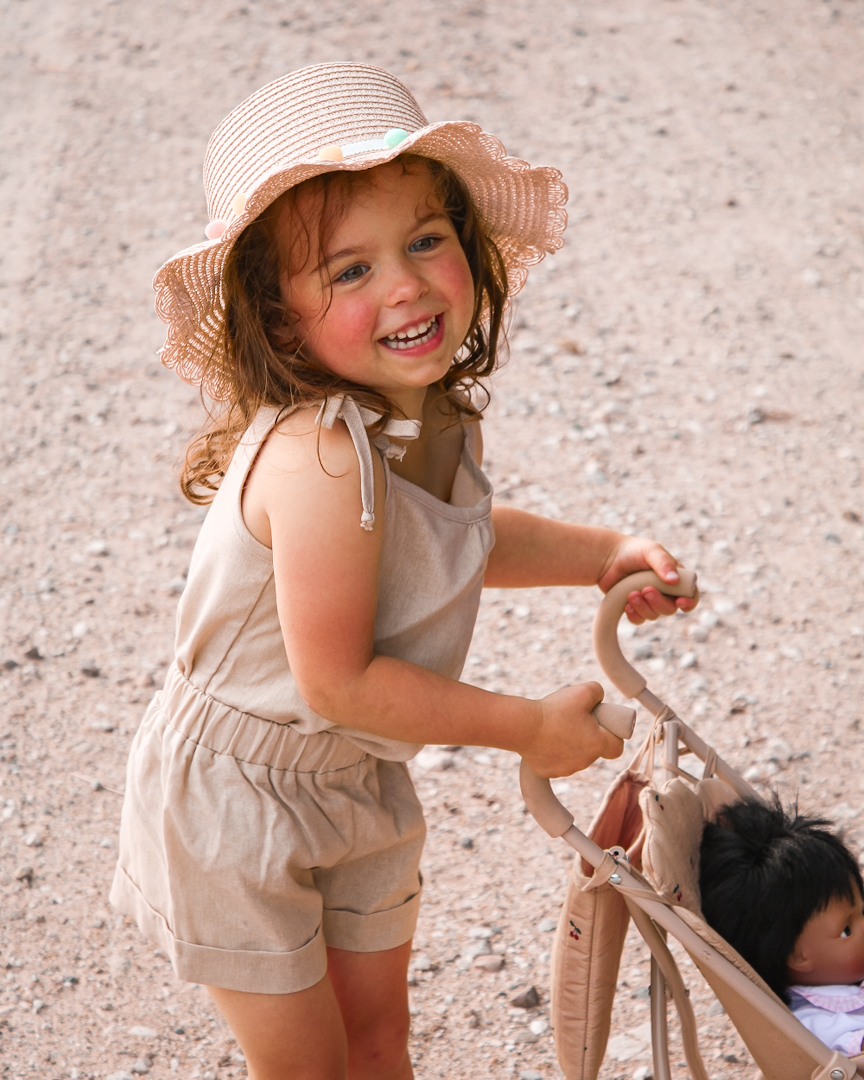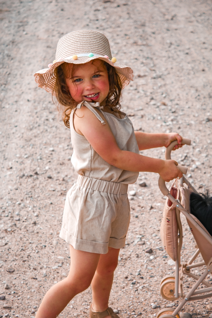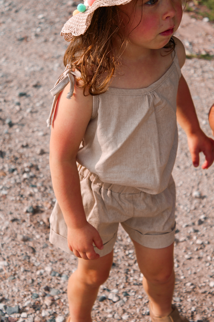 Komplet lniany beżowy bluzka wiązana+szorty to lekki komplet dziecięcy dla dziewczynki, idealny na sezon lato. Naturalny materiał zapewnia przewiewność i komfort nawet w ciepłe dni. Zestaw daje swobodę ruchu, dlatego dobrze sprawdza się podczas codziennych aktywności.