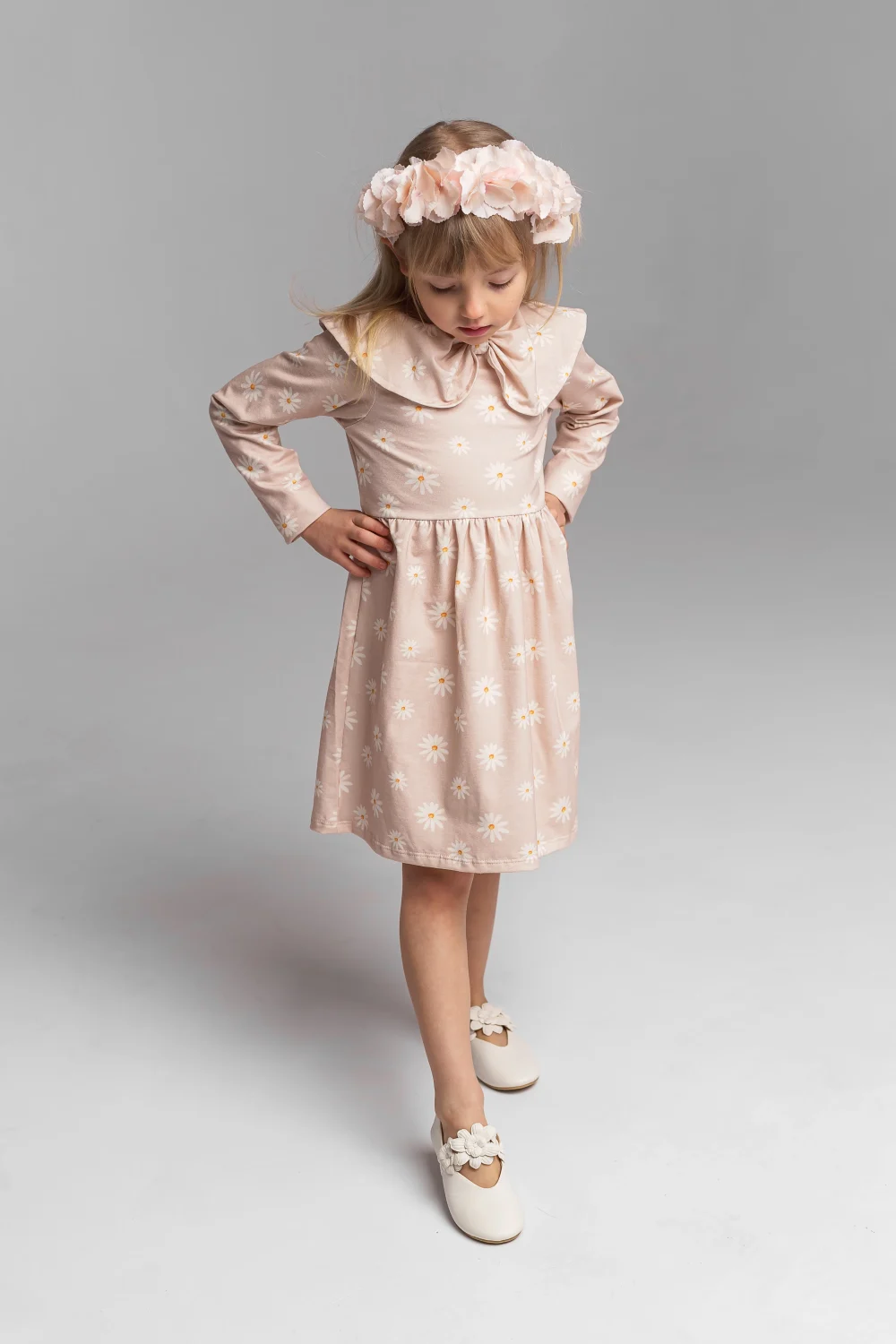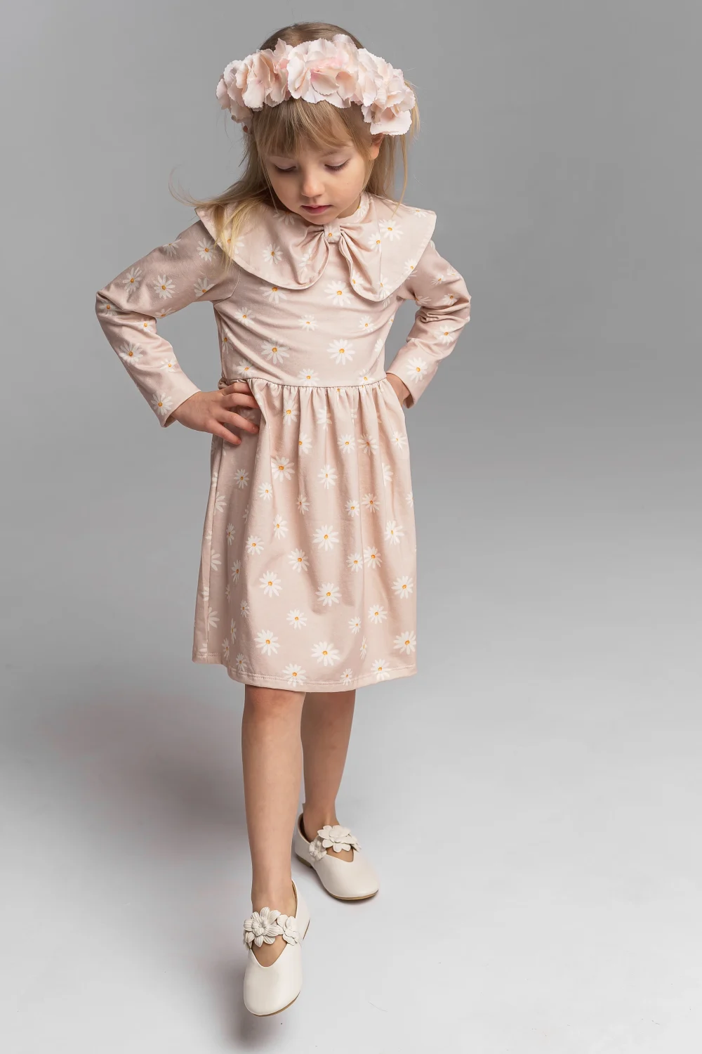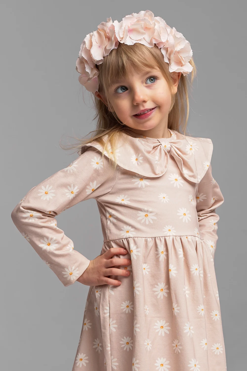 Prześliczna sukienka w delikatny wzór beżowych stokrotek, ozdobiona efektownym kołnierzem, to idealna propozycja dla dziewczynek, które lubią wygodę połączoną z subtelną elegancją. Doskonale sprawdzi się zarówno na co dzień, jak i na rodzinne uroczystości czy wyjścia.