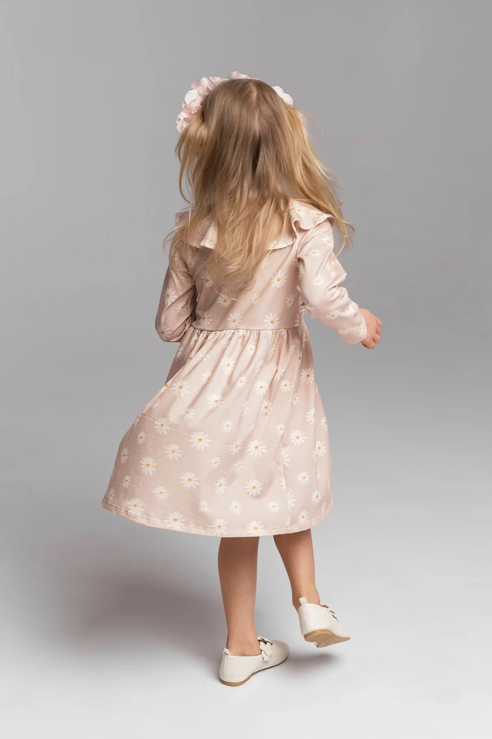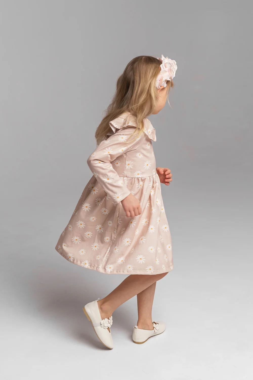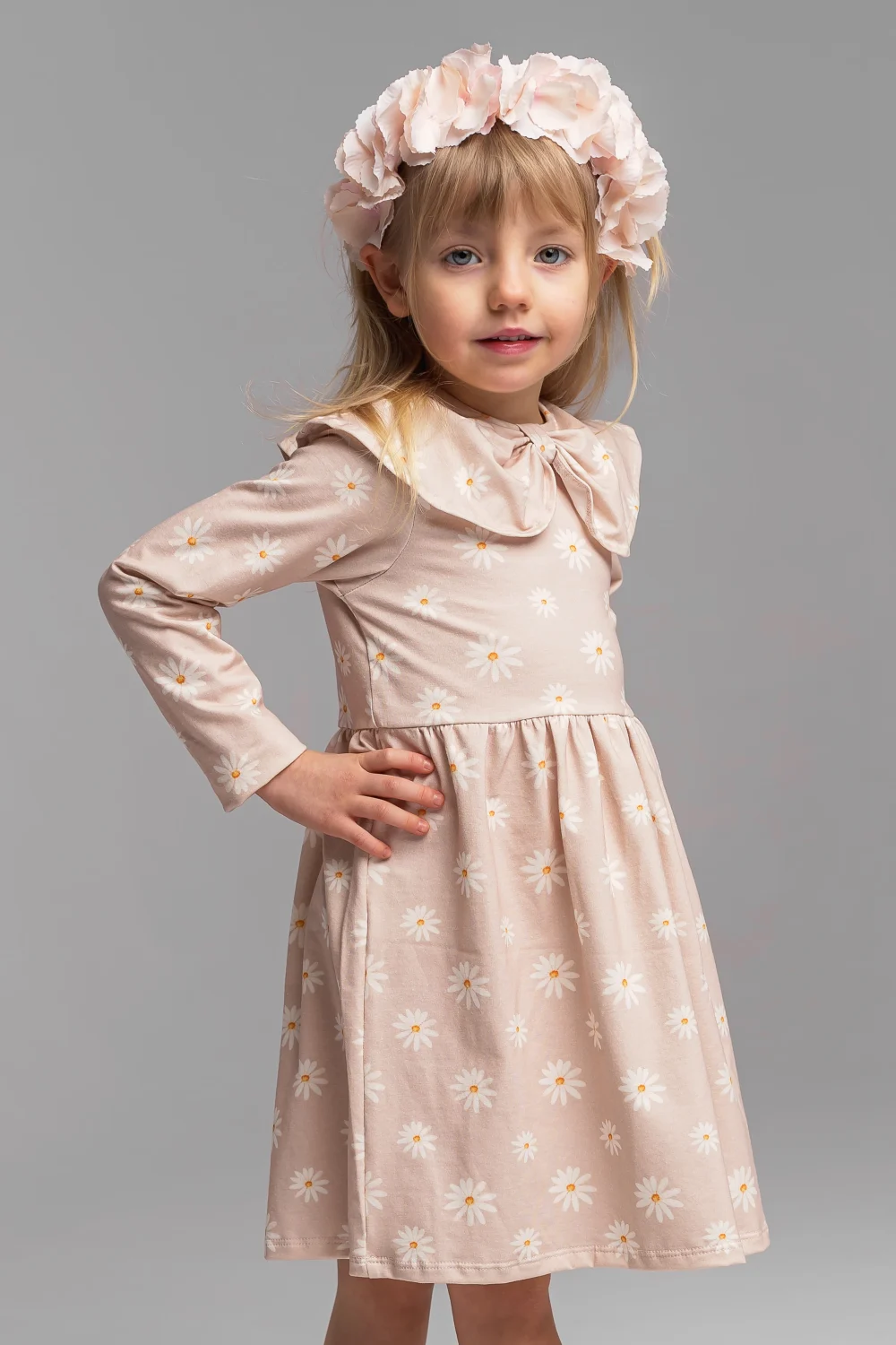 Prześliczna sukienka w delikatny wzór beżowych stokrotek, ozdobiona efektownym kołnierzem, to idealna propozycja dla dziewczynek, które lubią wygodę połączoną z subtelną elegancją. Doskonale sprawdzi się zarówno na co dzień, jak i na rodzinne uroczystości czy wyjścia.