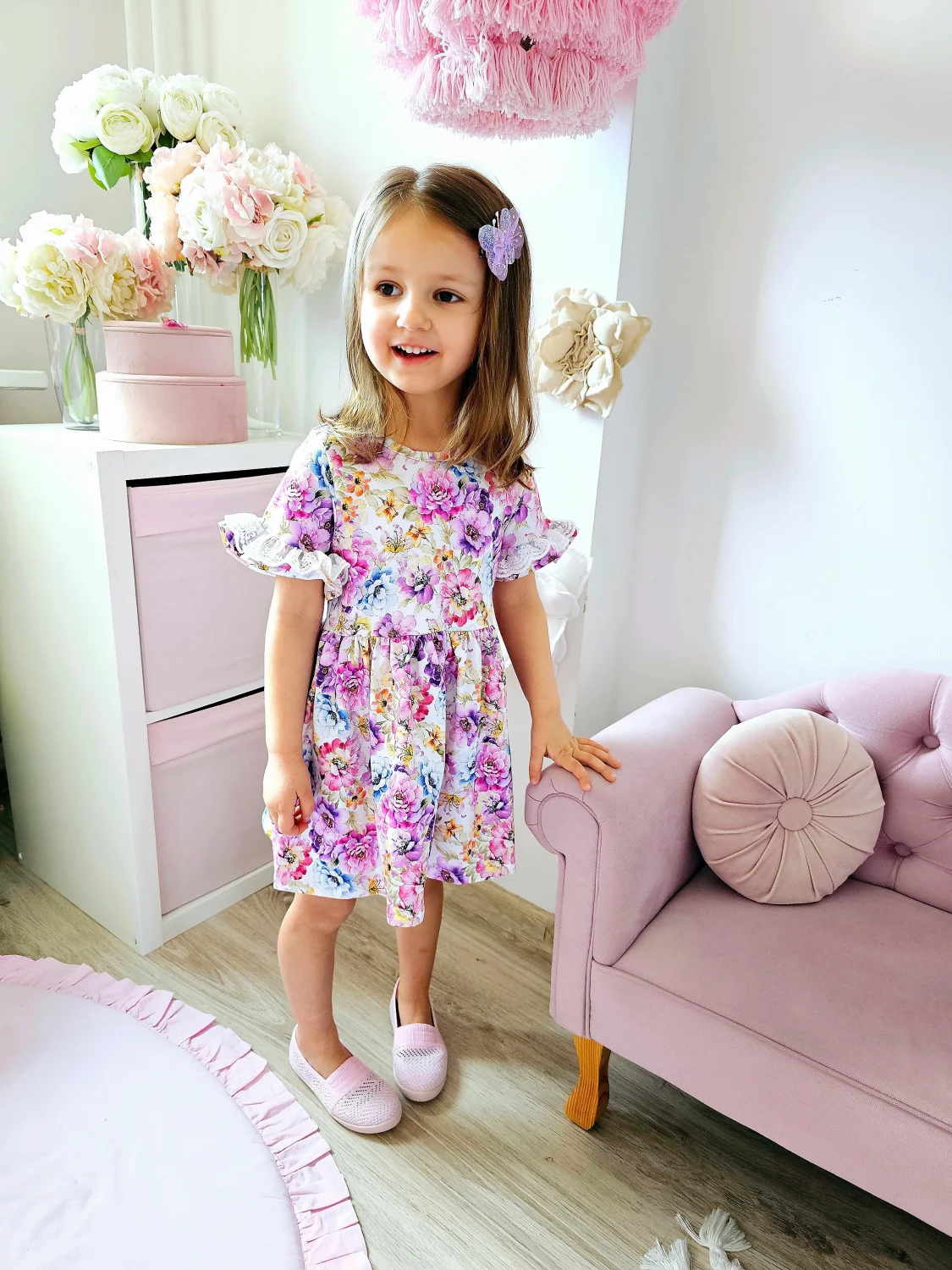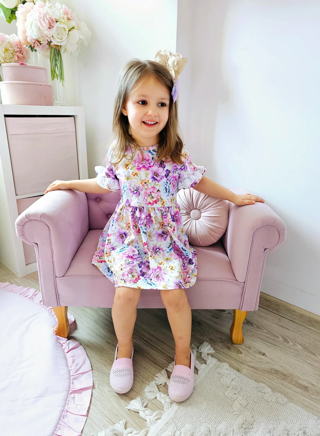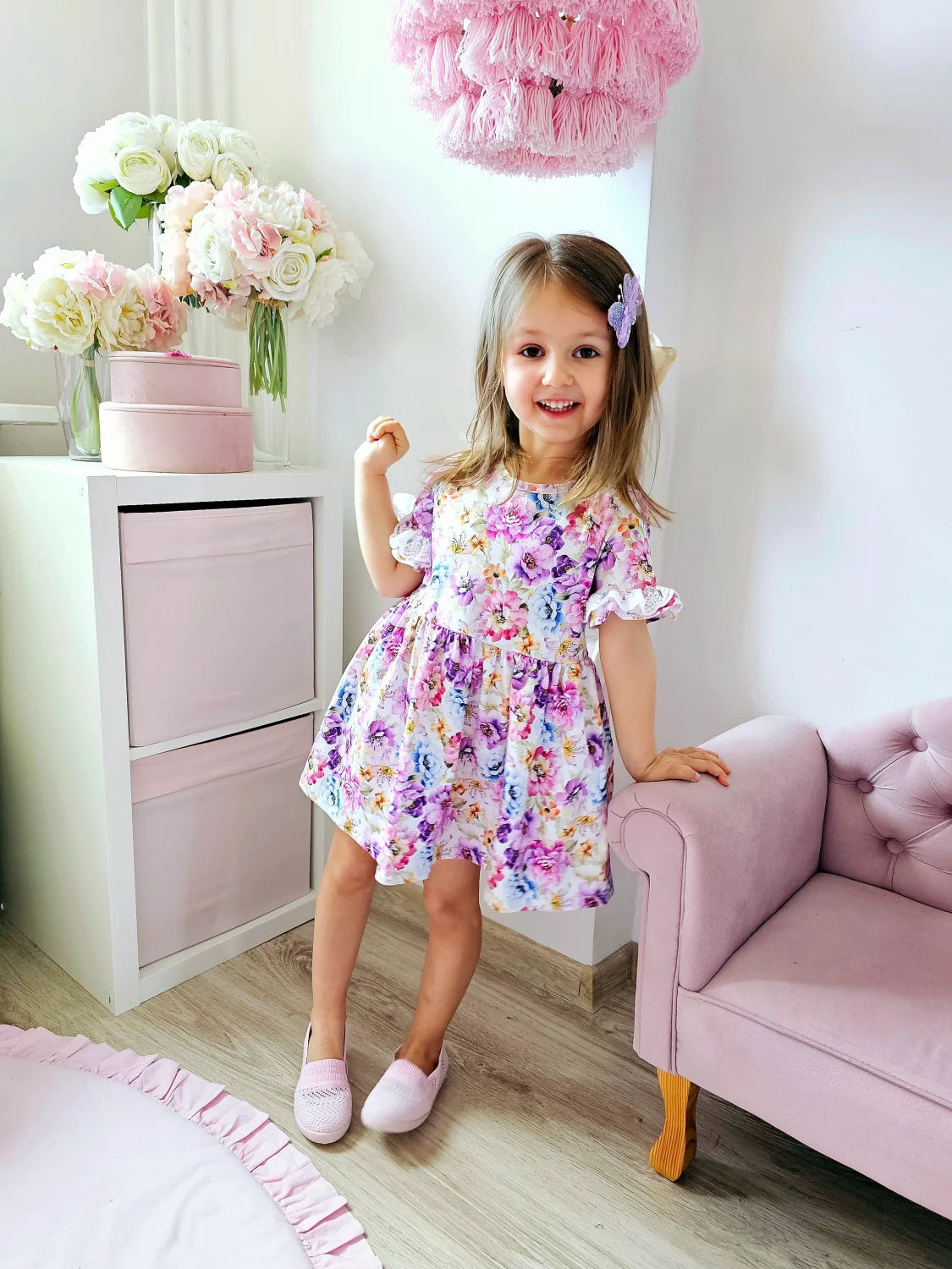 Sukienka wykonana jest z miękkiego i komfortowego materiału, przyjaznego dla wrażliwej skóry dziecka. Krótki rękawek zapewnia wygodę noszenia w cieplejsze dni, a kwiatowy wzór sprawia, że sukienka prezentuje się niezwykle efektownie.