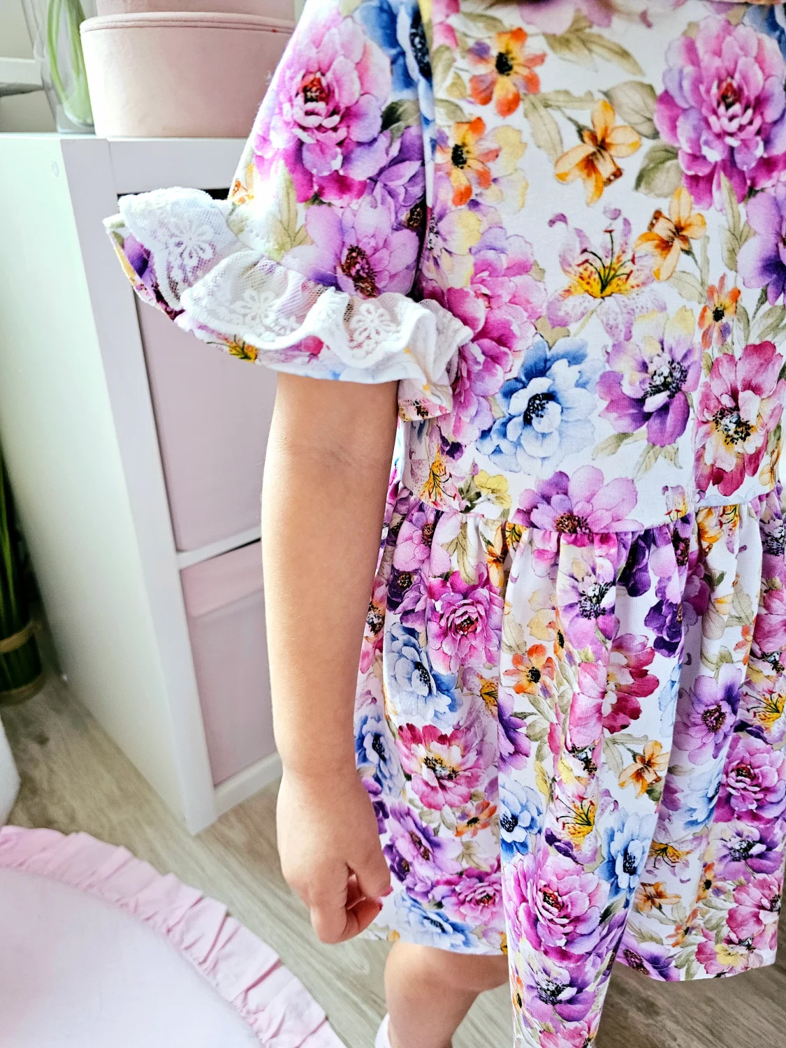 Sukienka dziewczęca z koronką – kolorowe bukiety | 74–140