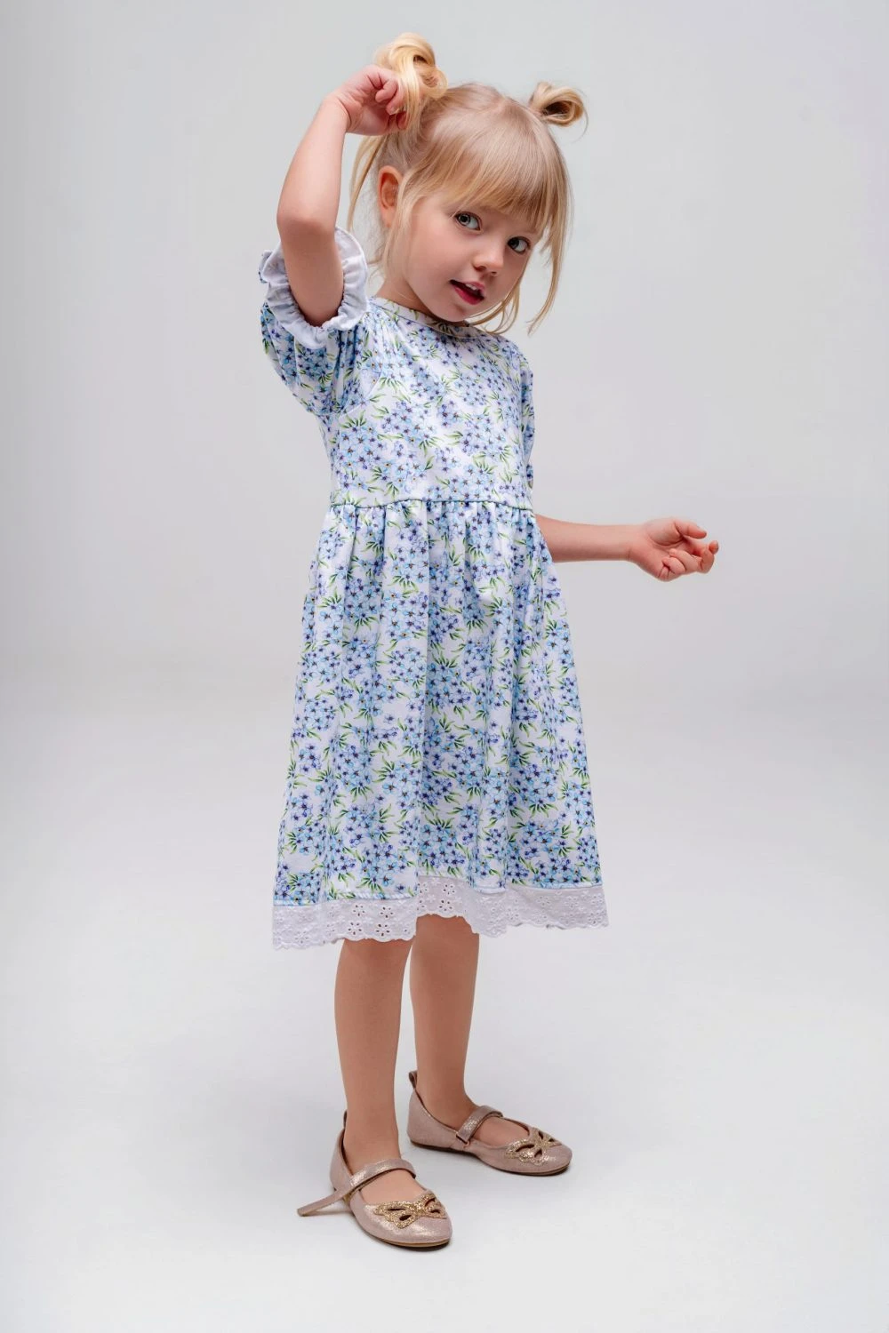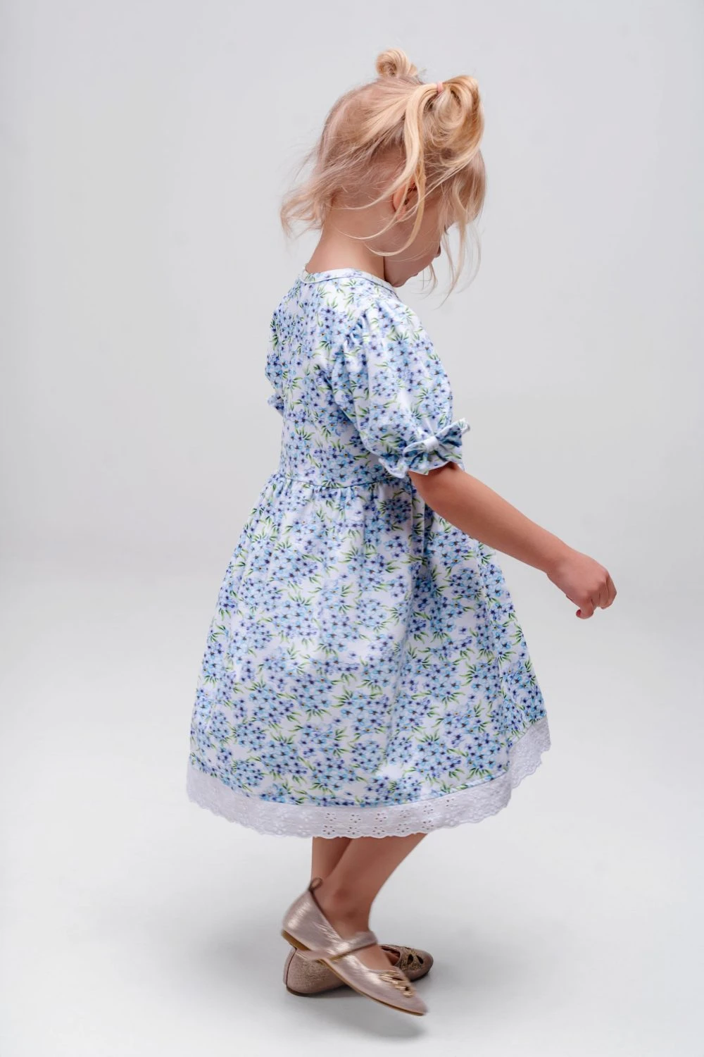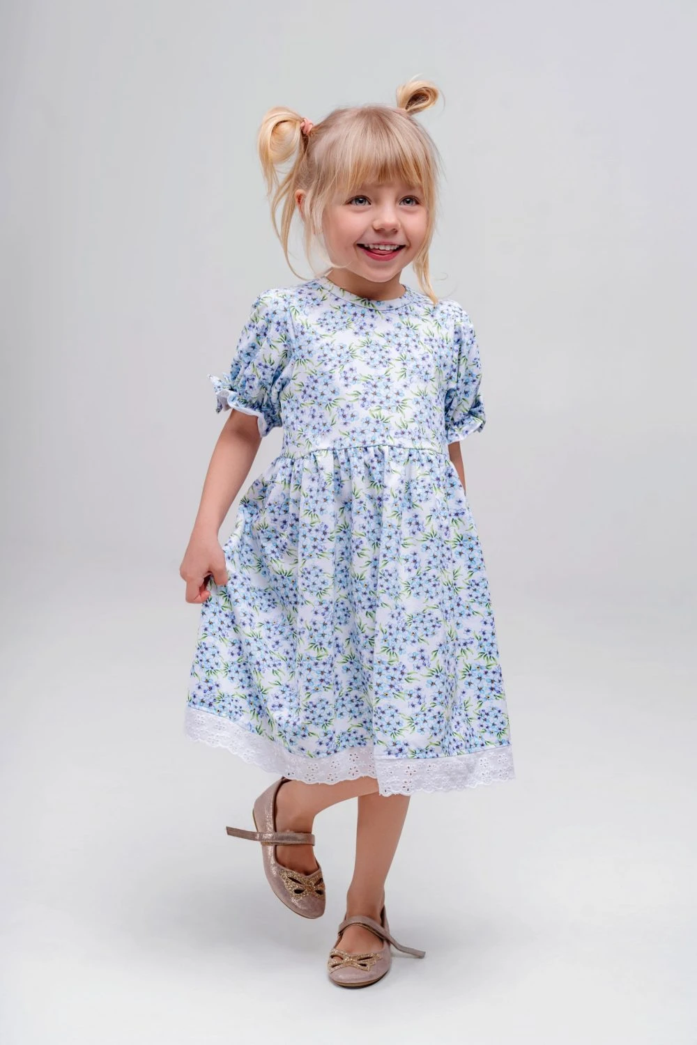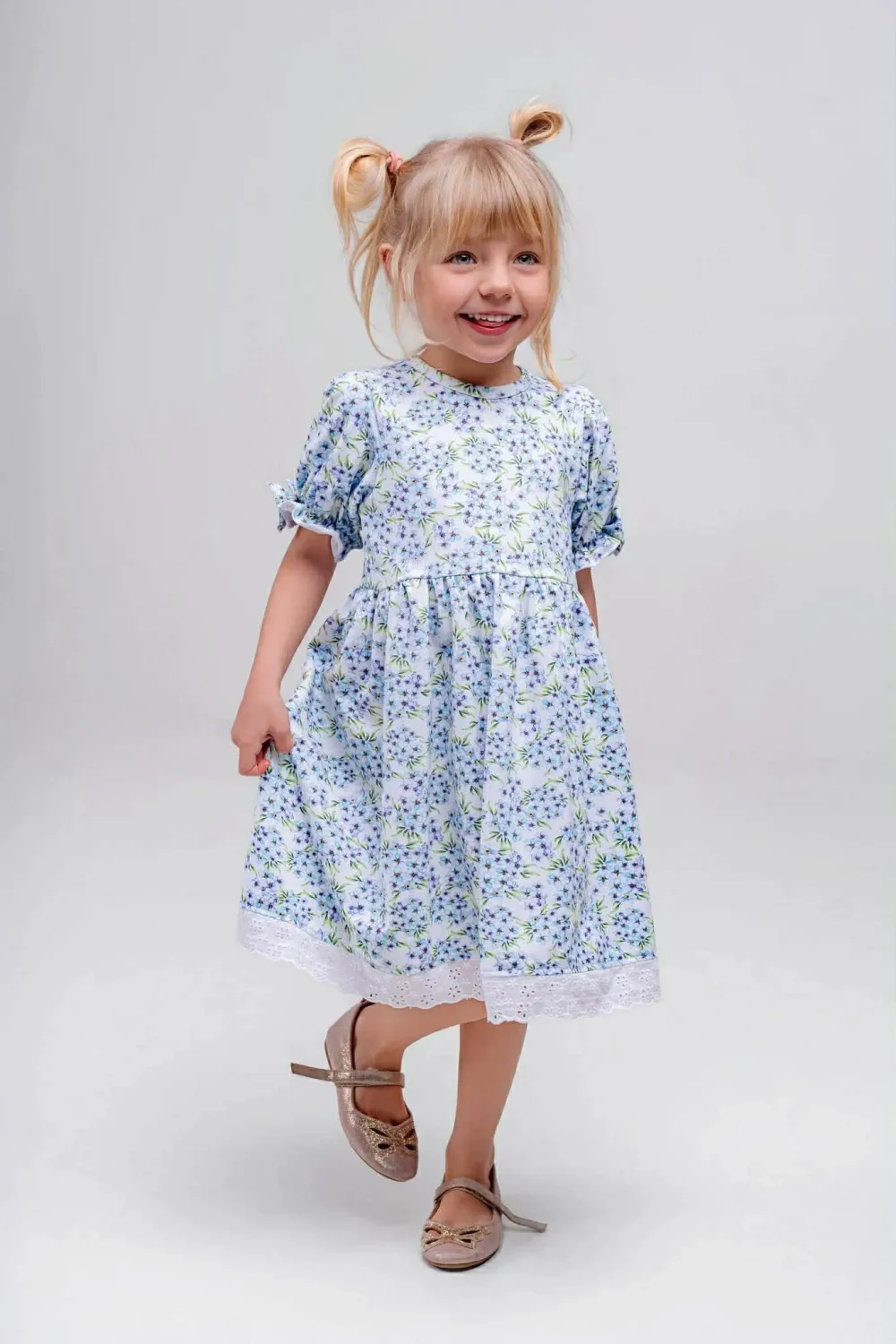 Sukienka dziewczęca w niezapominajki wykończona haftowaną koronką to wyjątkowo delikatna i elegancka propozycja dla dziewczynki. Subtelny wzór drobnych niezapominajek nadaje sukience lekkości i romantycznego charakteru, a ozdobne wykończenie z haftowanej koronki podkreśla jej dziewczęcy styl i staranne wykonanie.