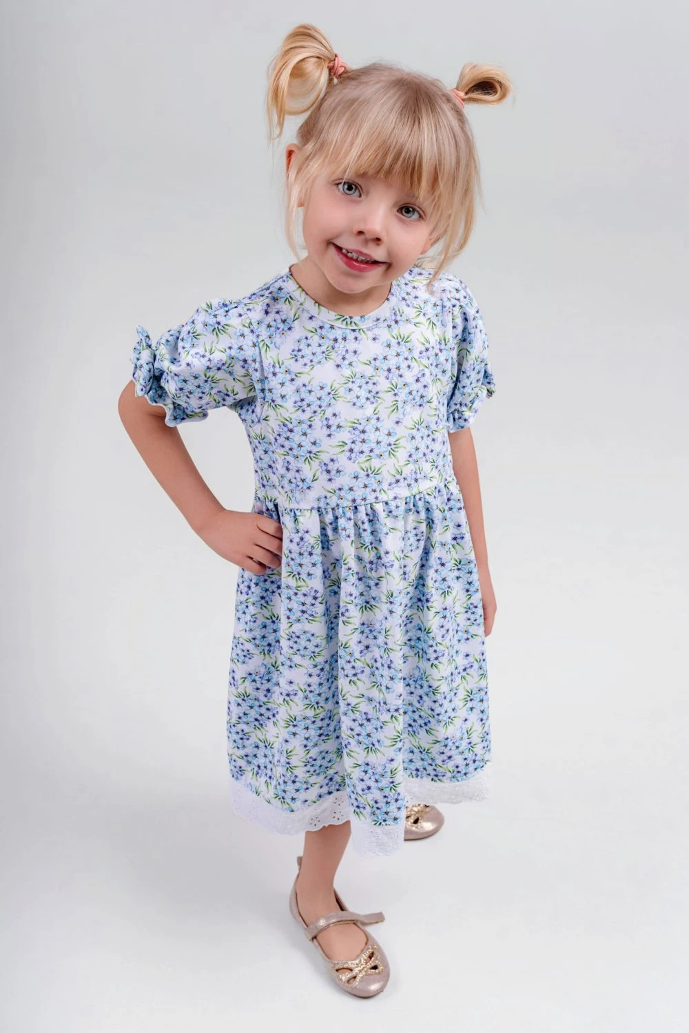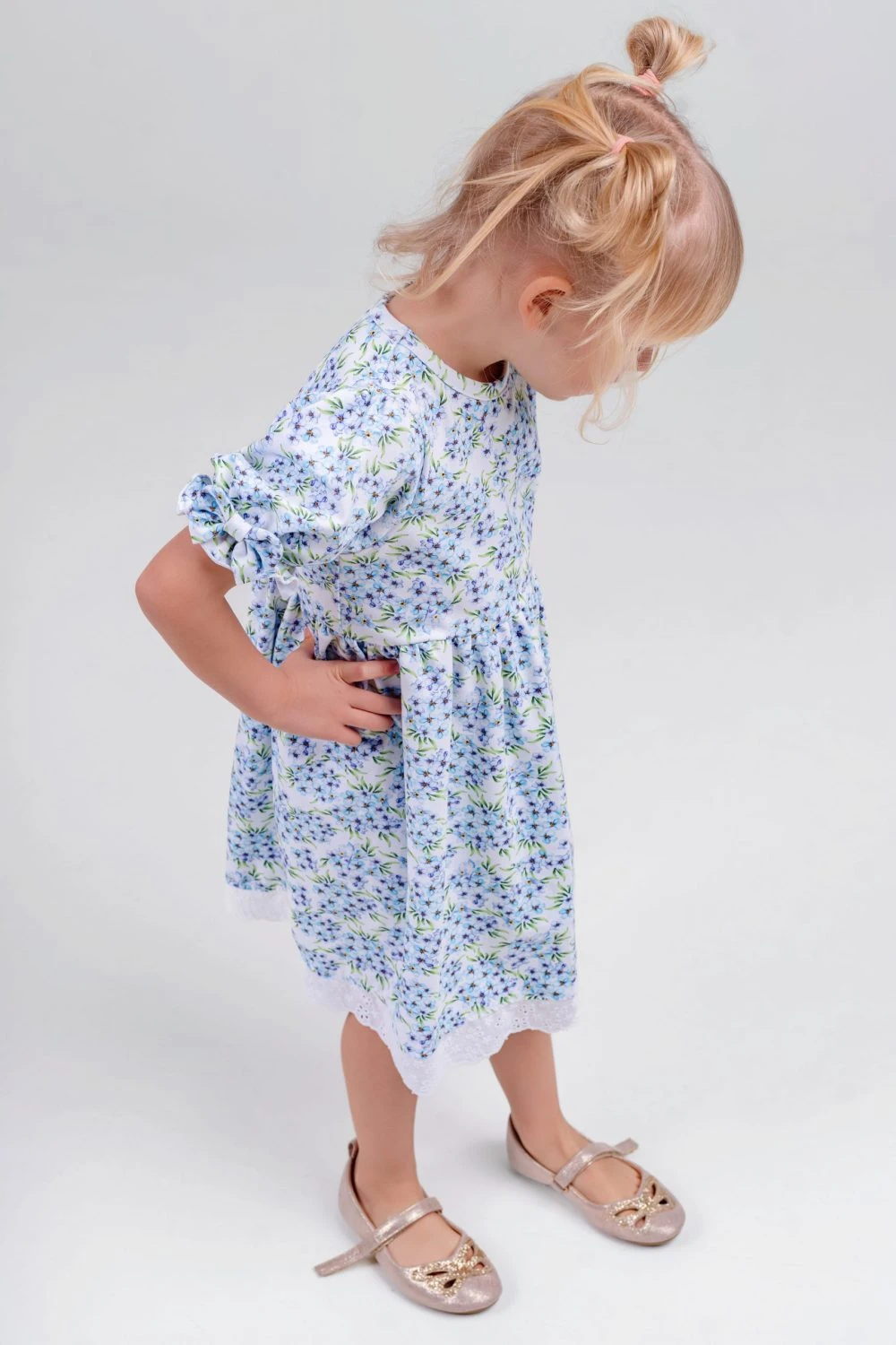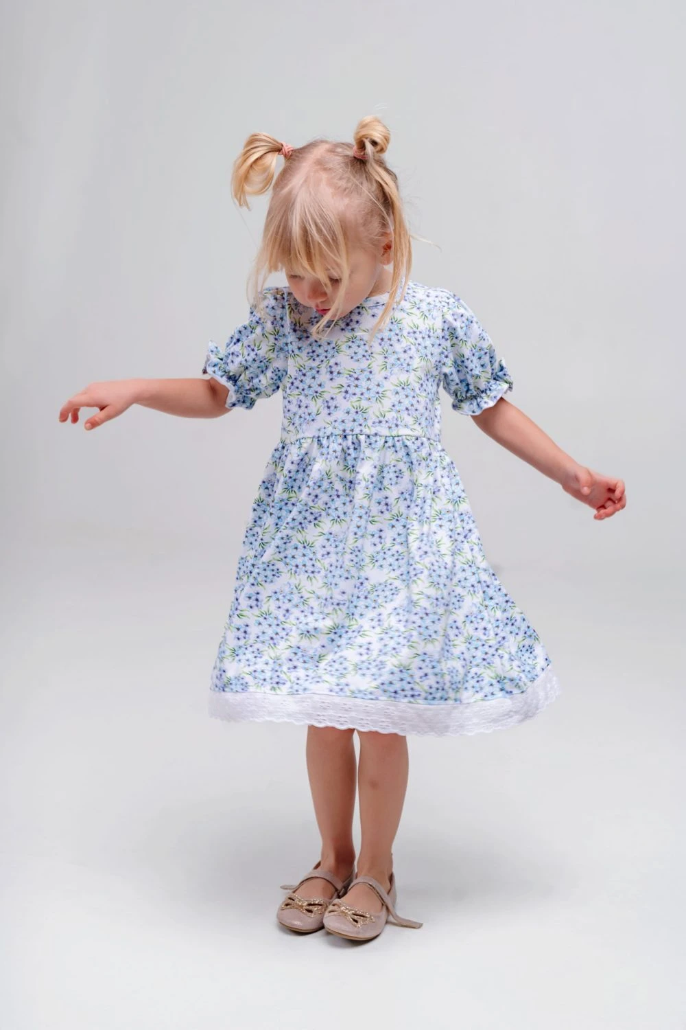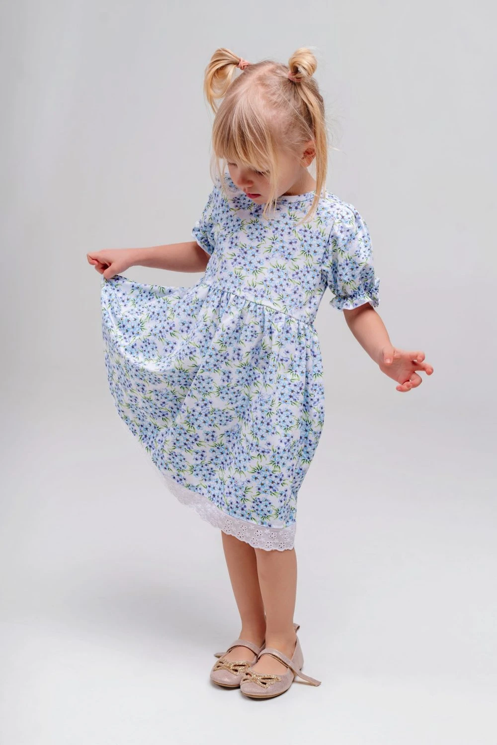 Sukienka dziewczęca w niezapominajki wykończona haftowaną koronką to wyjątkowo delikatna i elegancka propozycja dla dziewczynki. Subtelny wzór drobnych niezapominajek nadaje sukience lekkości i romantycznego charakteru, a ozdobne wykończenie z haftowanej koronki podkreśla jej dziewczęcy styl i staranne wykonanie.
