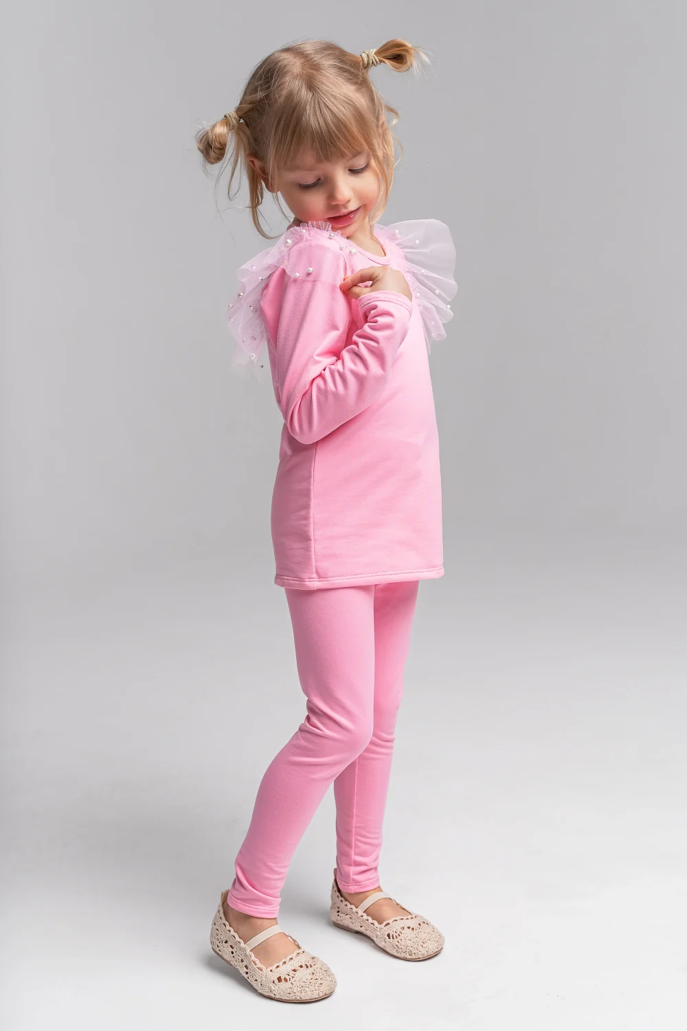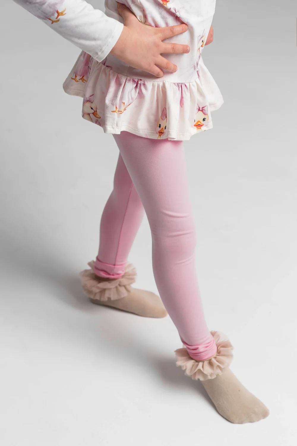 Wykonane z wysokiej jakości dzianiny o składzie 95% bawełna, 5% elastan, są miękkie, przyjazne dla delikatnej skóry dziecka i oddychające. Prążkowana struktura materiału nadaje im modny wygląd i sprawia, że świetnie komponują się zarówno z bluzami, jak i tunikami czy sukienkami.