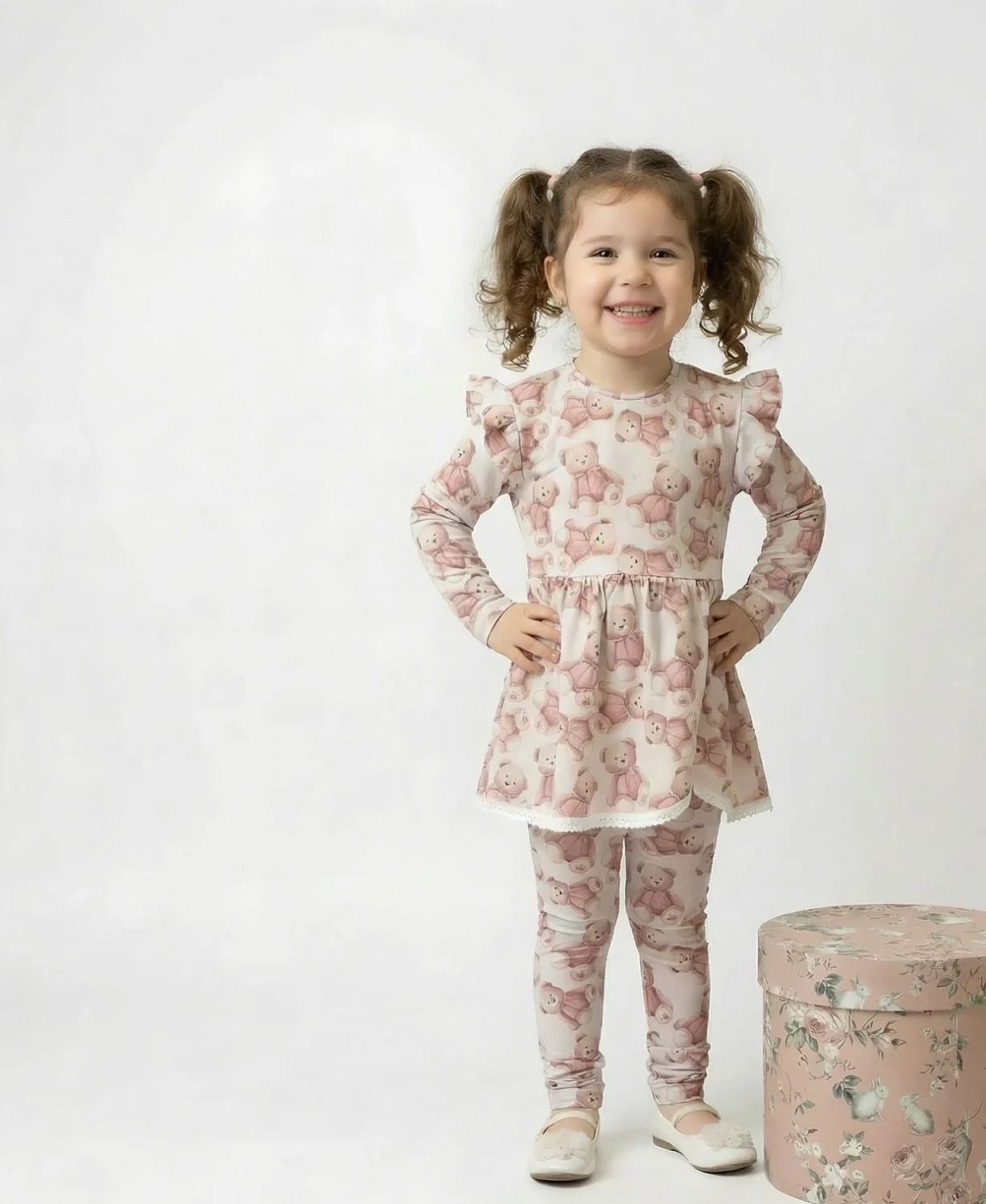 Wzór w słodkie misie pięknie komponuje się z tuniką z tej samej kolekcji, tworząc śliczny i praktyczny komplet.