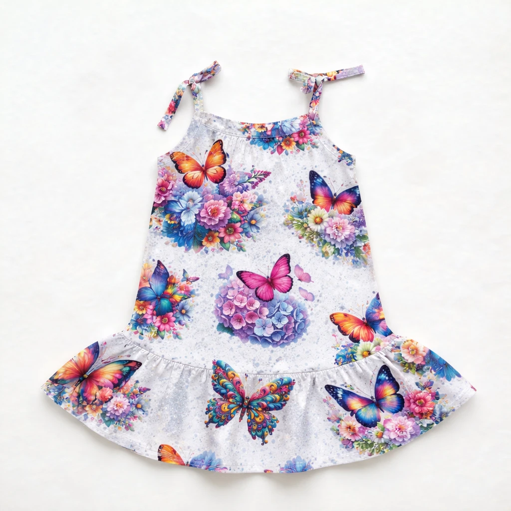 Urocza sukienka dziewczęca z kolorowym motywem motyli i kwiatów to idealny wybór na wiosnę i lato. Delikatne tło oraz intensywne, bajkowe ilustracje motyli wśród kwiatowych kompozycji tworzą wyjątkowy, dziewczęcy wzór, który przyciąga uwagę i dodaje stylizacji lekkości oraz uroku.