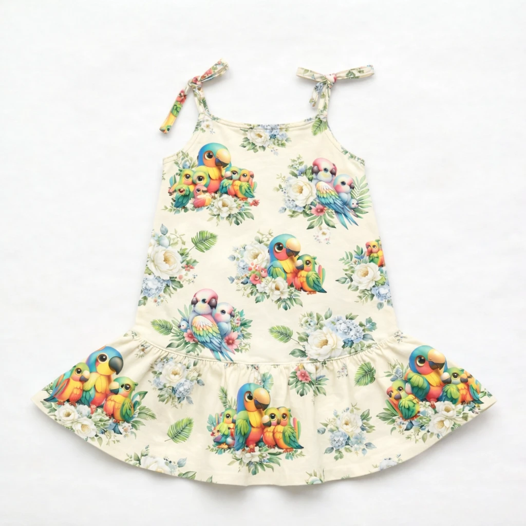 Kolorowa sukienka dziewczęca z uroczym motywem tropikalnych papug i kwiatów to idealna propozycja na ciepłe dni. Delikatne, jasne tło w połączeniu z barwnymi ilustracjami papug tworzy wyjątkowy, radosny wzór inspirowany naturą i egzotyczną przyrodą. Sukienka przyciąga uwagę i dodaje stylizacji dziewczęcego uroku.