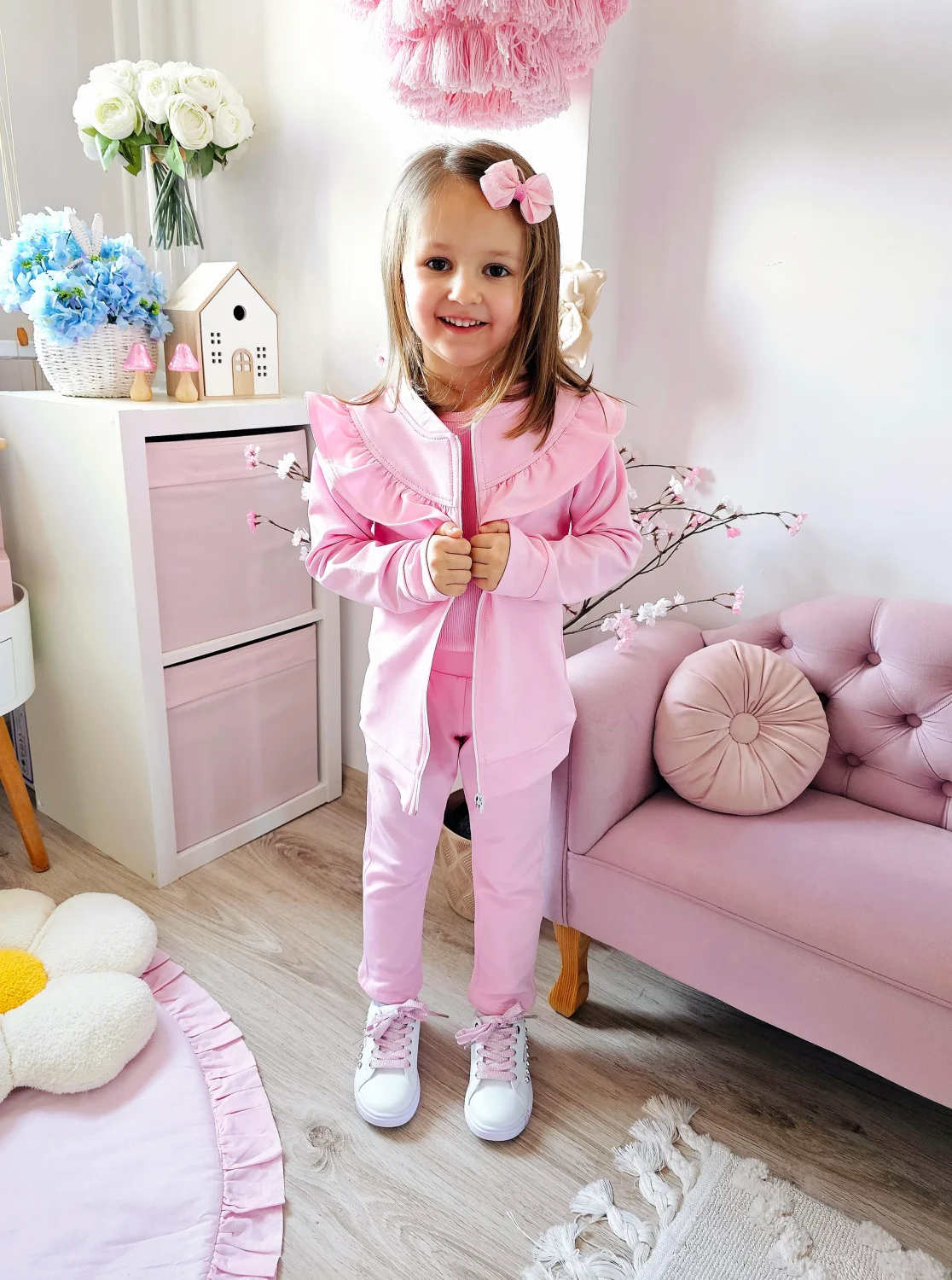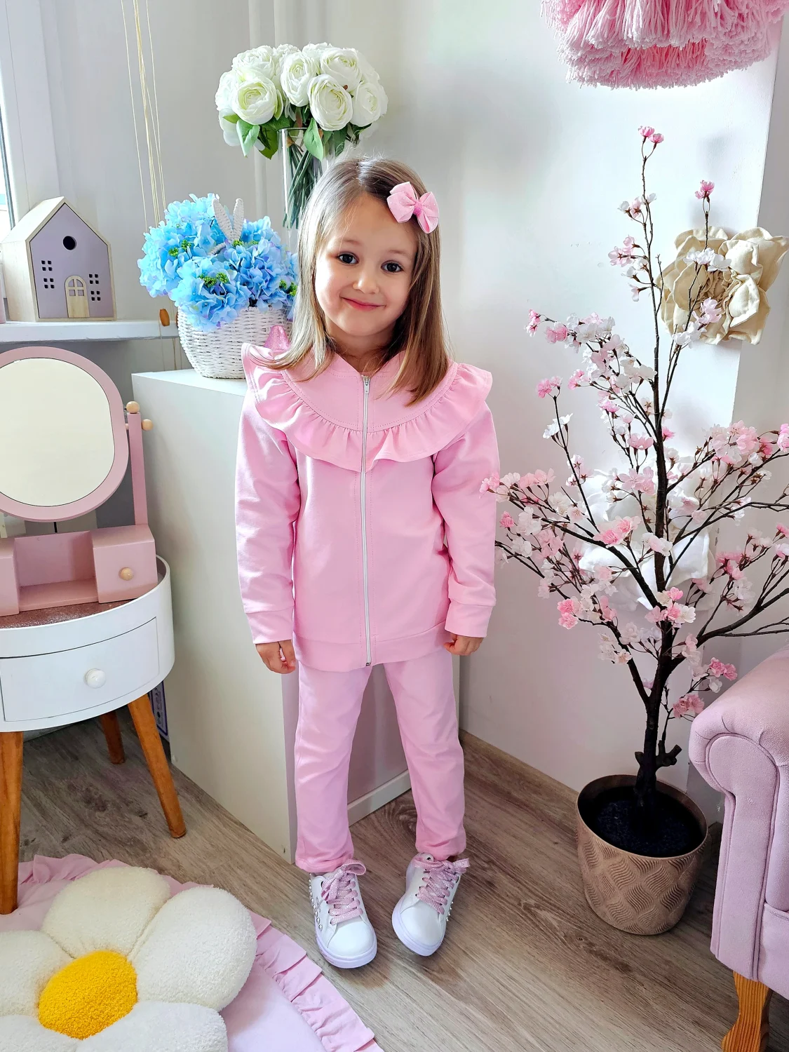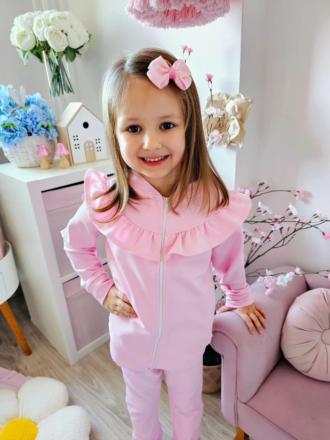 Stylowa i wygodna rozpinana bluza dresowa dla dziewczynki w kolorze cukierkowego różu to idealna propozycja na co dzień oraz na chłodniejsze dni. Dziewczęca falbana z przodu nadaje bluzie wyjątkowego uroku i sprawia, że klasyczna bluza zyskuje modny, dekoracyjny charakter.