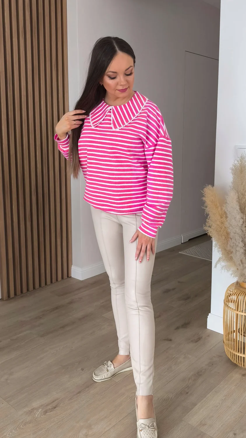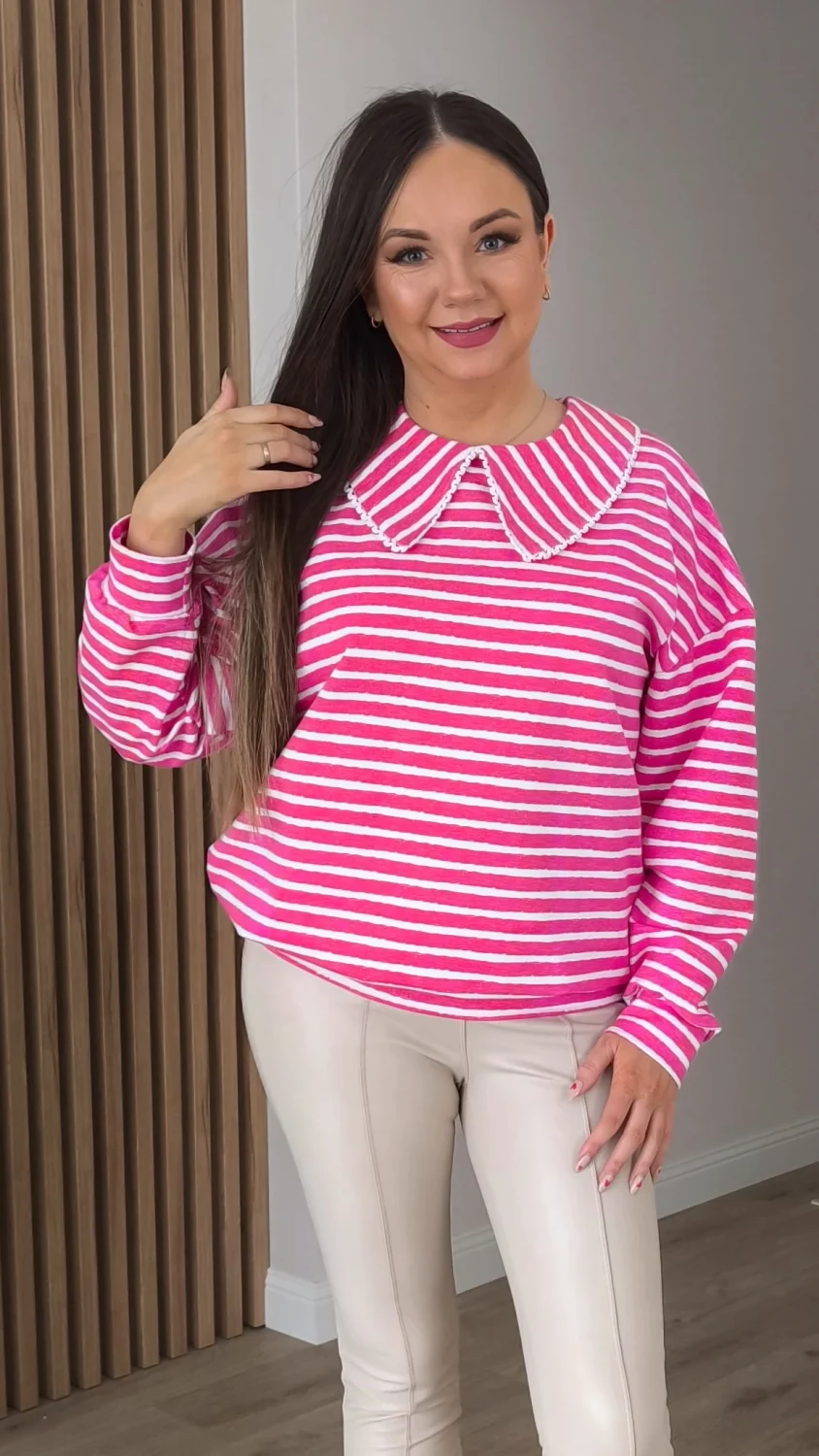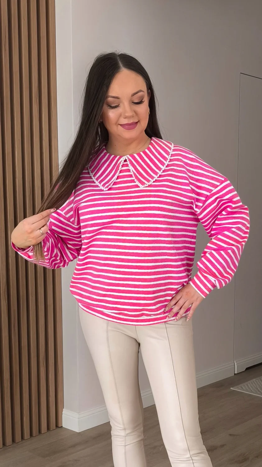 Bluzka damska w paski z kołnierzykiem – różowo-biała | Bawełniana, komfortowa, oversize