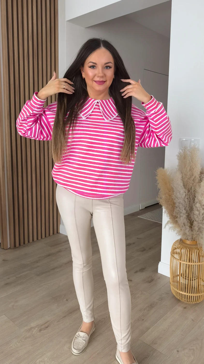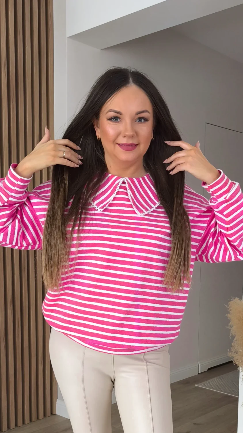 Stylowa bluzka damska w modny różowo-biały wzór w paski to idealne połączenie wygody i kobiecego designu. Model wyróżnia się ozdobnym kołnierzykiem oraz luźnym krojem typu oversize, który zapewnia swobodę ruchów i doskonale układa się na sylwetce. To świetny wybór zarówno do codziennych stylizacji, jak i casualowych outfitów do pracy czy na spotkania.